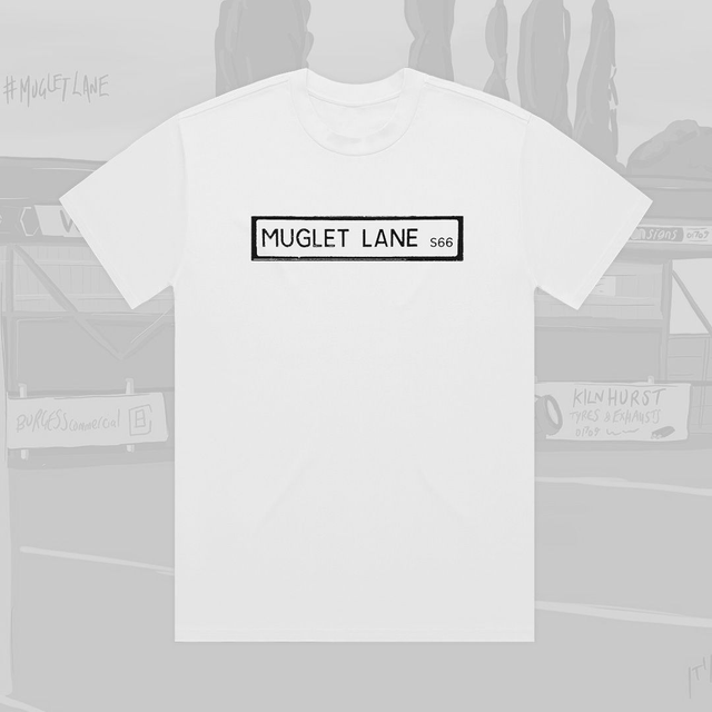 White T-Shirt with Muglett Lane printed on the chest and the back features imagery from a vintage MMFC program.